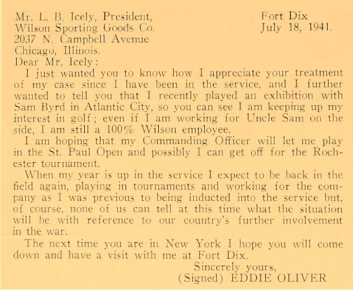 It was January 1941. There was war in Europe and the United States was building up its army. Ed “Porky” Oliver, a 25-year-old established tournament player with three victories on the PGA Tour, was on the West Coast playing the Winter Tour. In the second week of January he was competing in the Oakland Open when a messenger boy broke through the gallery and presented him with a telegram on the 10th tee. The telegram contained orders to report to his draft board for a physical. Oliver shook hands with his fellow competitors and withdrew from the tournament. He drove across the country to his hometown of Wilmington, Delaware. Even though he was the professional at Hornell CC in New York his home address with the Draft Board was Wilmington. Oliver passed the physical but was given a “Hardship Deferral”, as he was the sole support of his family. His brother was making just $16 a week working in a factory.