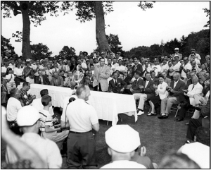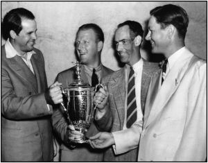 The 1939 US Open, hosted by the Philadelphia CC, ended in a triple tie. From L to R: defending champion Ralph Guldahl, Craig Wood, Denny Shute and Byron Nelson. An 18-hole playoff was held that eliminated Shute. In a second 18-hole playoff Nelson was victorious. The video was made by a man who worked for Eastman Kodak and was visiting a friend. The man had to return to work, missing the Monday playoff. The pictures for that round were stills dubbed in by Bill Orr’s Telra Productions.