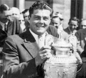 Joe Kirkwood, Jr. was born in Australia in 1922 and came to Philadelphia with his father as a baby. He worked for his father as an assistant at the Huntingdon Valley Country Club in 1940 and 41. In 1949 he returned to Philadelphia and won the Inquirer Invitation tournament at the Whitemarsh Valley Country Club. It was his first of three wins on the PGA Tour but his main occupation was in Hollywood. He made numerous movies, many of them staring as a fictitious boxer named Joe Palooka. His first movie called “Joe Palooka, Champ” came out in May of 1946. He played in three U.S. Opens, four PGA Championships and five Masters Tournaments.